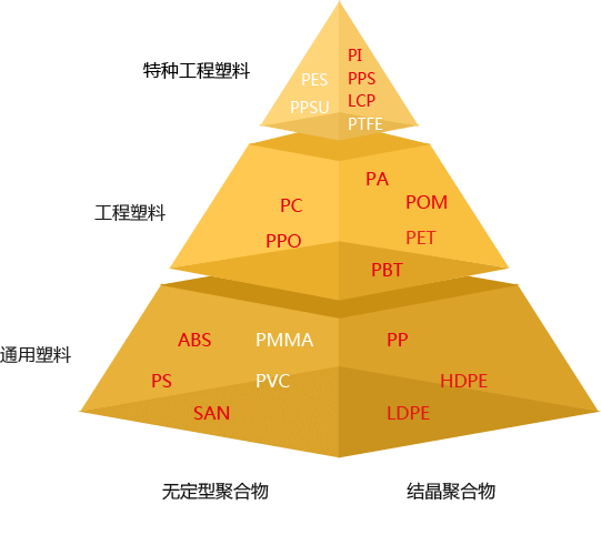 工程塑料一般是指可以作為結(jié)構(gòu)材料承受機械應(yīng)力,能在較寬的溫度范圍和較為苛刻的化學(xué)及物理環(huán)境中使用的塑料材料。工程塑料可分為通用工程塑料和特種工程塑料兩大類。通用工程塑料通常是指已大規(guī)模工業(yè)化生產(chǎn)的、應(yīng)用范圍較廣的5種塑料,即聚酰胺(尼龍,PA)、聚碳酸酯(聚碳,PC)、聚甲醛(POM)、聚酯(主要是PBT)及聚苯醚(PPO)。而特種工程塑料則是指性能更加優(yōu)異獨特,但目前大部分尚未大規(guī)模工業(yè)化生產(chǎn)或生產(chǎn)規(guī)模較小、用途相對較窄的一些塑料,如聚苯硫醚(PPS)、聚酰亞胺(PI)、聚砜(PSF)、聚醚酮(PEK)、液晶聚合物(LCP)等。 工程塑料性能優(yōu)良,可替代金屬作結(jié)構(gòu)材料,因而被廣泛用于電子電氣、交通運輸、機械設(shè)備及日常生活用品等領(lǐng)域,在國民經(jīng)濟中的地位日益顯著。